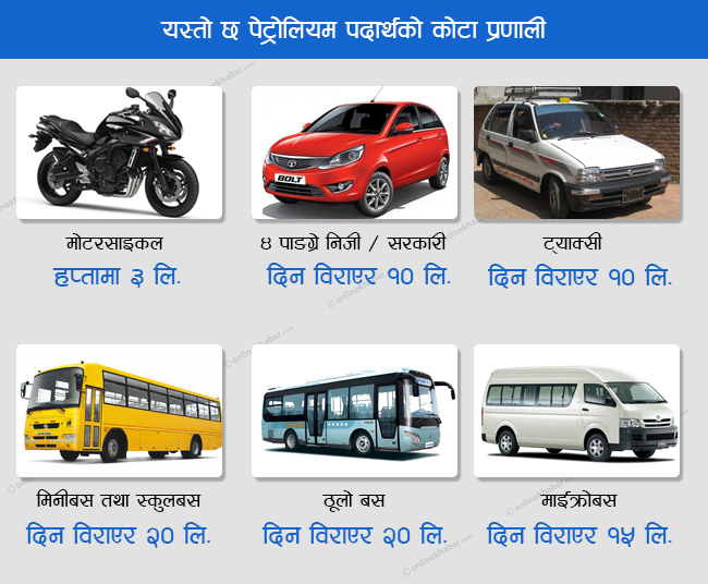 उनका अनुसार अब मोटरसाइकलले हप्तामा ३ लिटर मात्रै पेट्रोल पाउनेछन् । यसैगरी चारपांग्रे निजी, सरकारी तथा संस्थानका सवारी साधनले हप्तामा १० लिटर पेट्रोल पाउने बरालले बताए । यस्तै ट्याक्सीले भने जोर-बिजोर प्रणालीमा आफ्नो पालो परेको दिनमा १० लिटर पेट्रोल पाउनेछन् ।